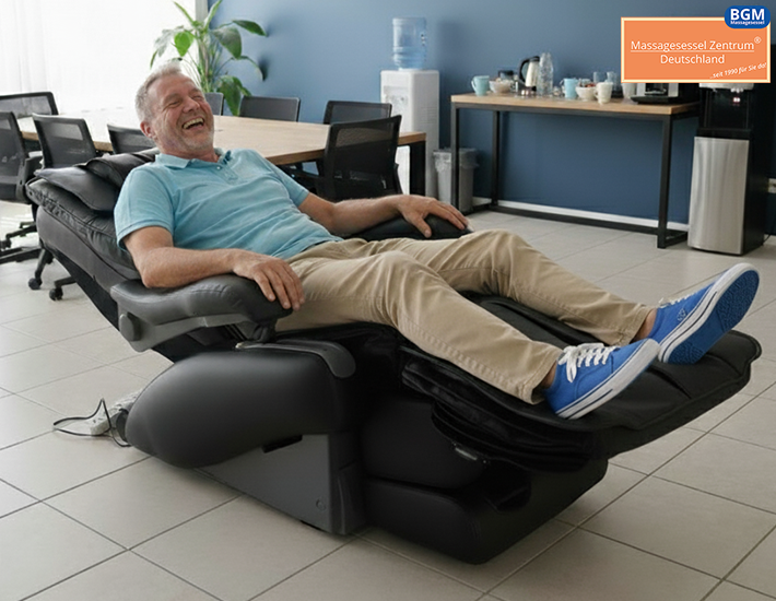 Dieser innovative BGM-Massagesessel verzichtet bewusst auf ein Fußteil, wodurch Nutzer ihre Schuhe während der Massage anbehalten können – für maximale Bequemlichkeit und Zeitersparnis.